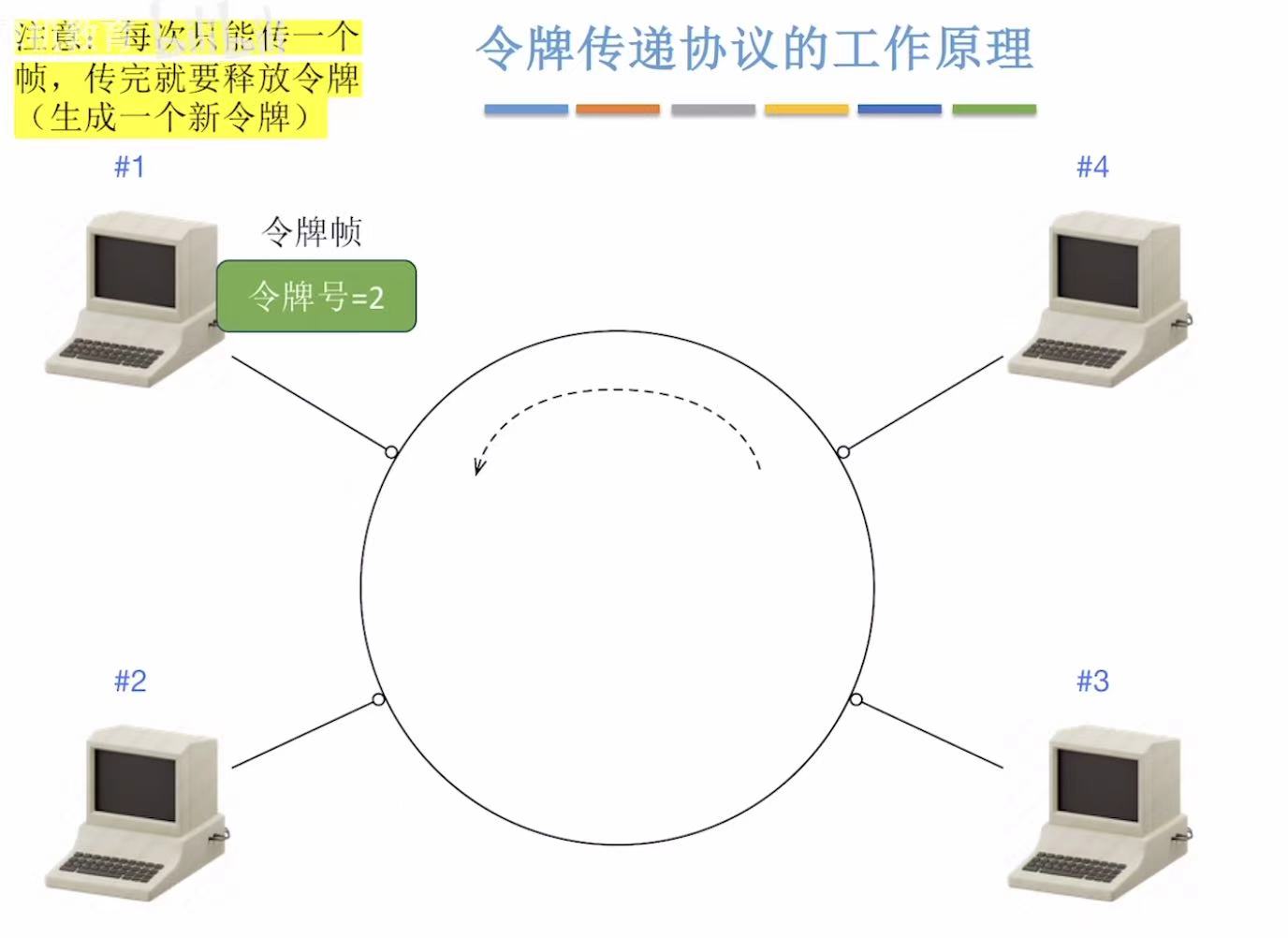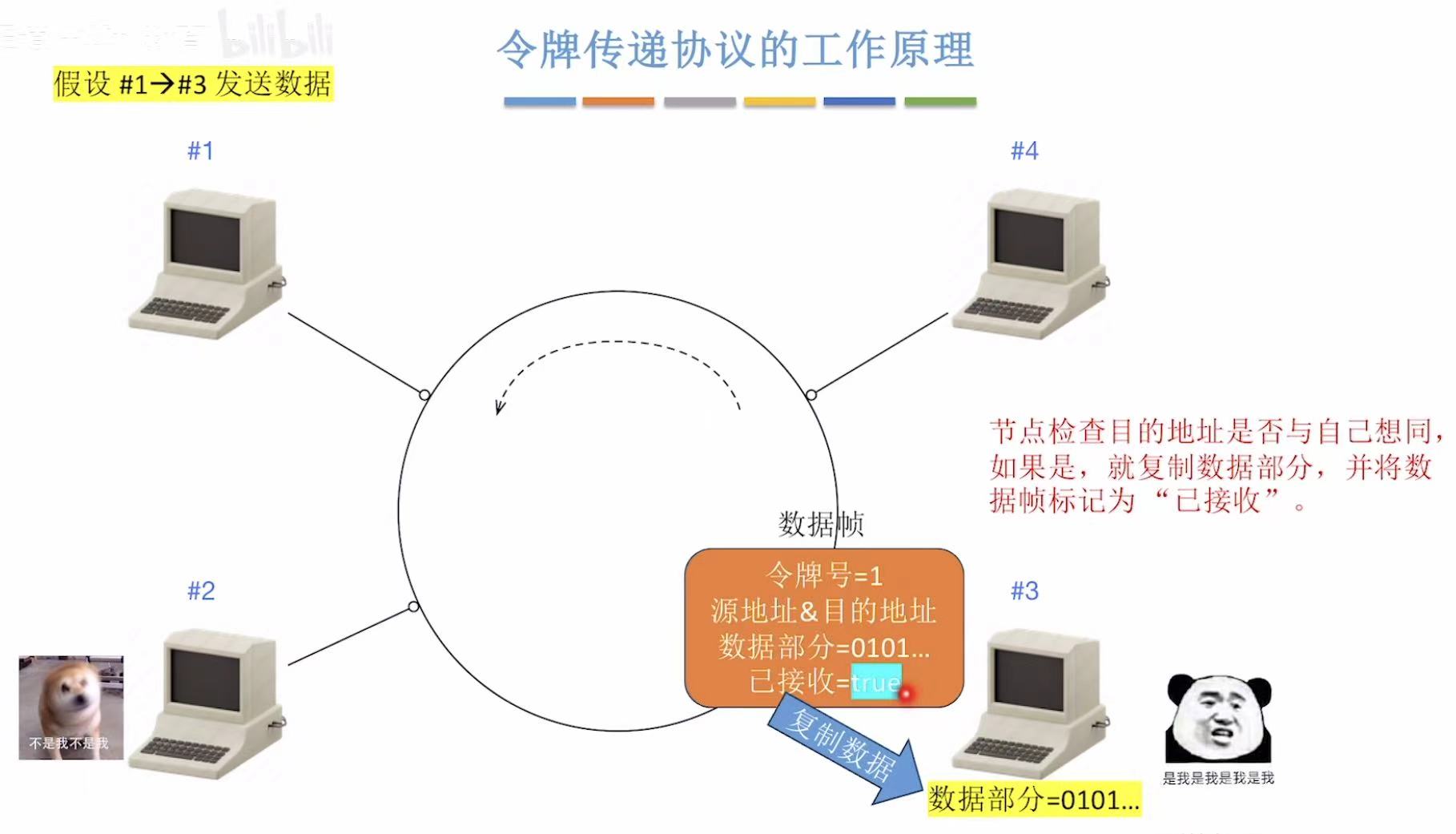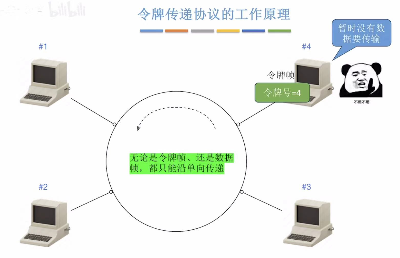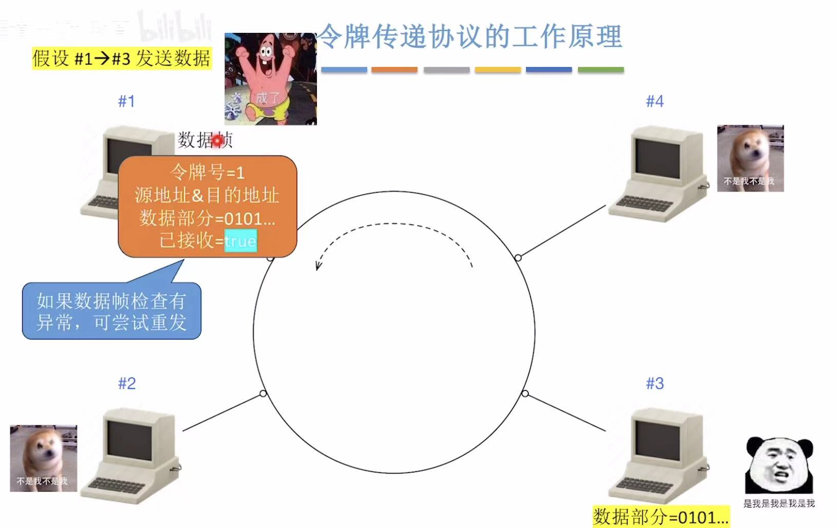 别看我放了那么多张图,简单概括就是,传给谁令牌号就是谁,令牌号对上了就变成数据帧落地成盒,然后这个令牌帧继续来回转圈儿。