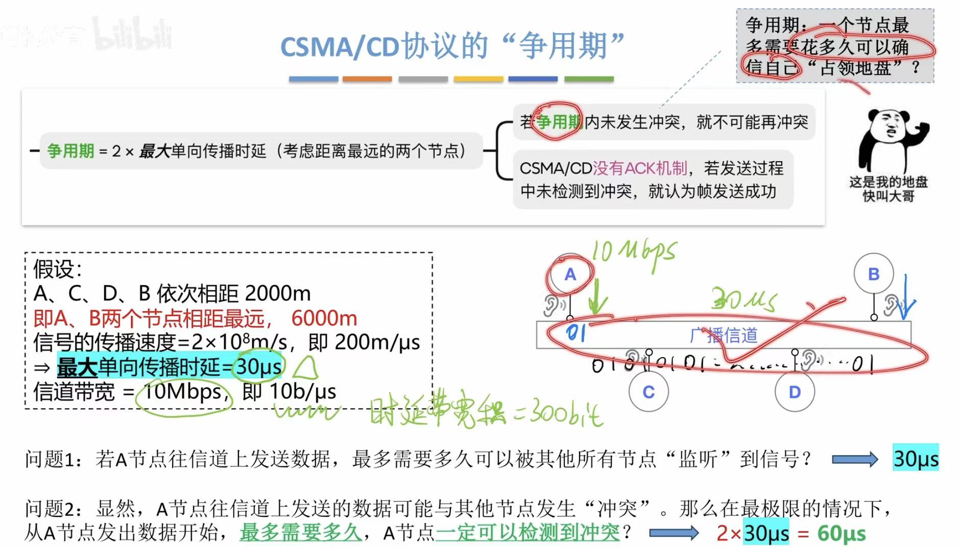 假设A到B传输需要30s,发生了冲突,传回A就又需要30s,所以一共需要60s,A才能检测到冲突。(极限情况)(确信)