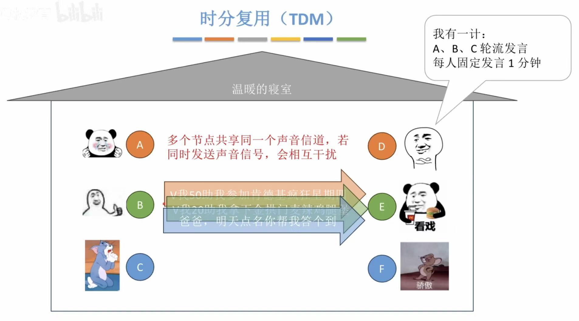 为了让想说的人及时说,不想说的人就直接跳过,所以寝室长决定动态分配 每个人说话的时长,谁需要就给谁说话的时间,这就是统计时分复用 。