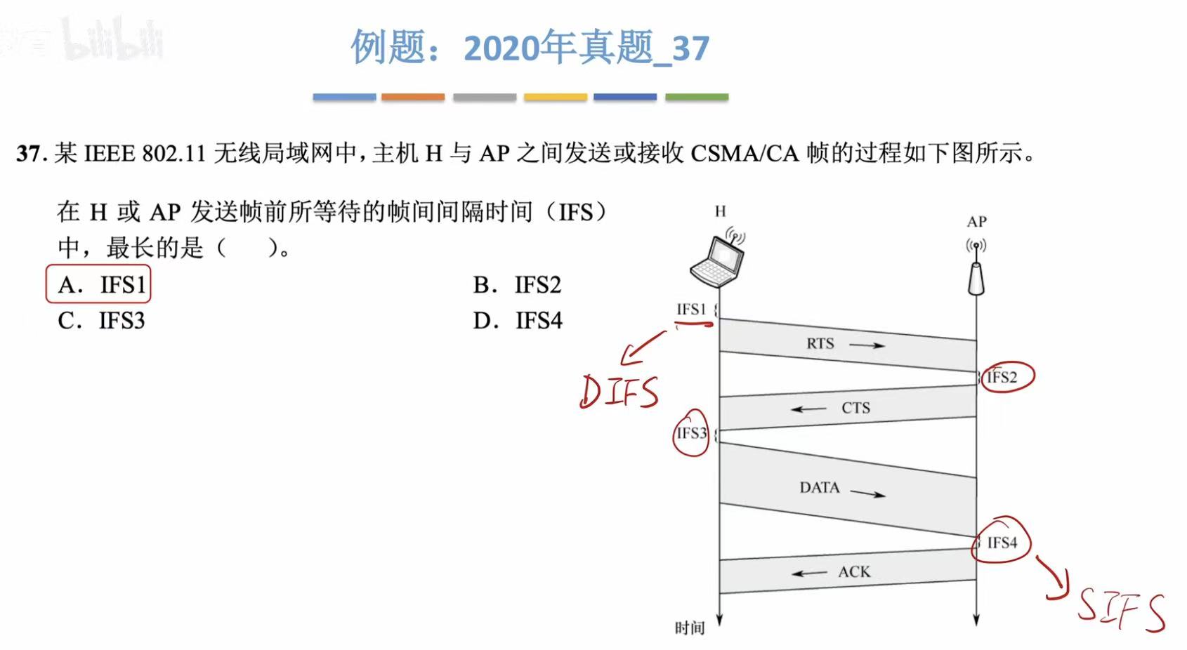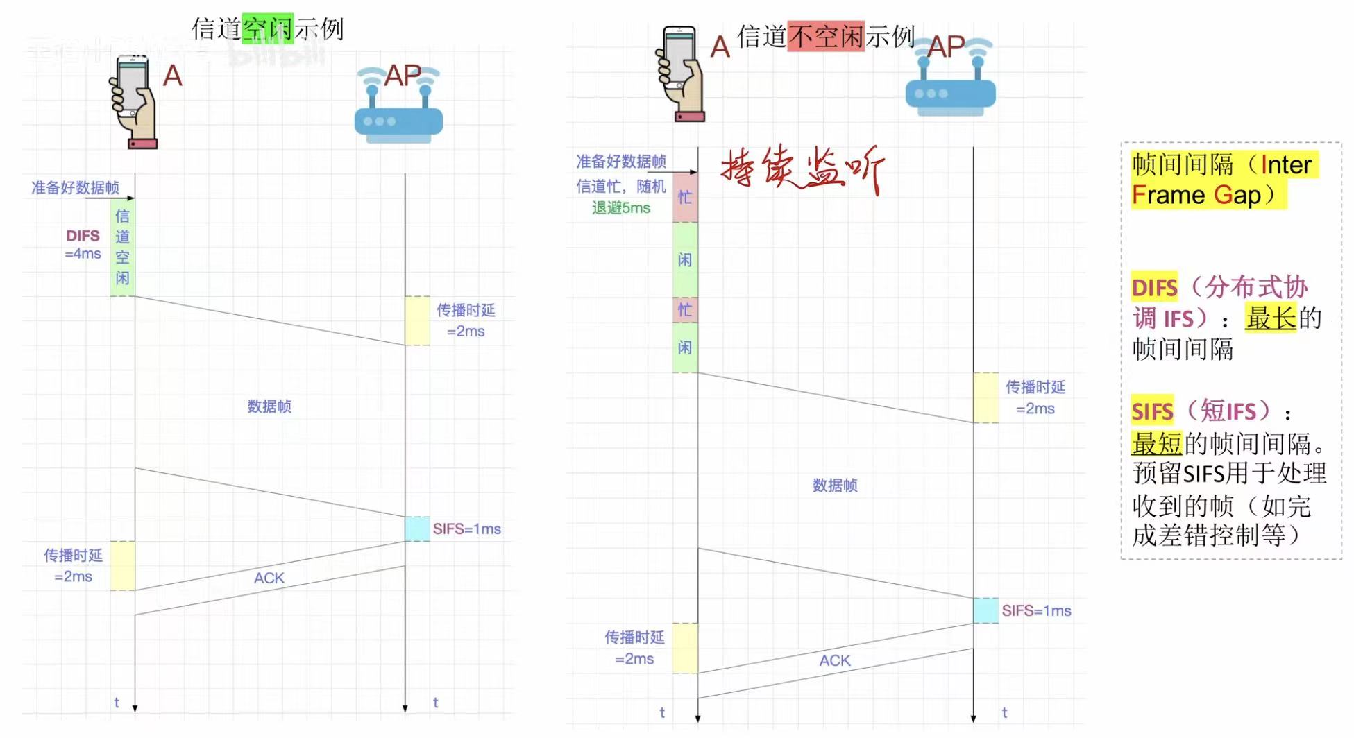 - 数据帧√-->立马发送-->ACK×-->等了一会儿-->啥都不管,继续发