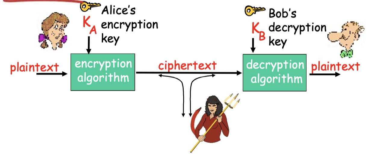 - 过程: Bob拿到你公开的公钥, 把消息锁进盒子, 寄给你; 只有私钥才能打开; 即时盒子被截断, 别人也打不开