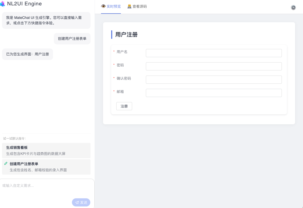 为了方便大家验证,我把这个引擎的完整代码都开源了。大家可以去 GitCode 仓库 https://gitcode.com/kaminono/MateChatNL2UIEngine 看看源码,或者直接点这个 https://mate-chat-nl-2-ui-engine-components.vercel.app/ 在线体验一下"说话变界面"。