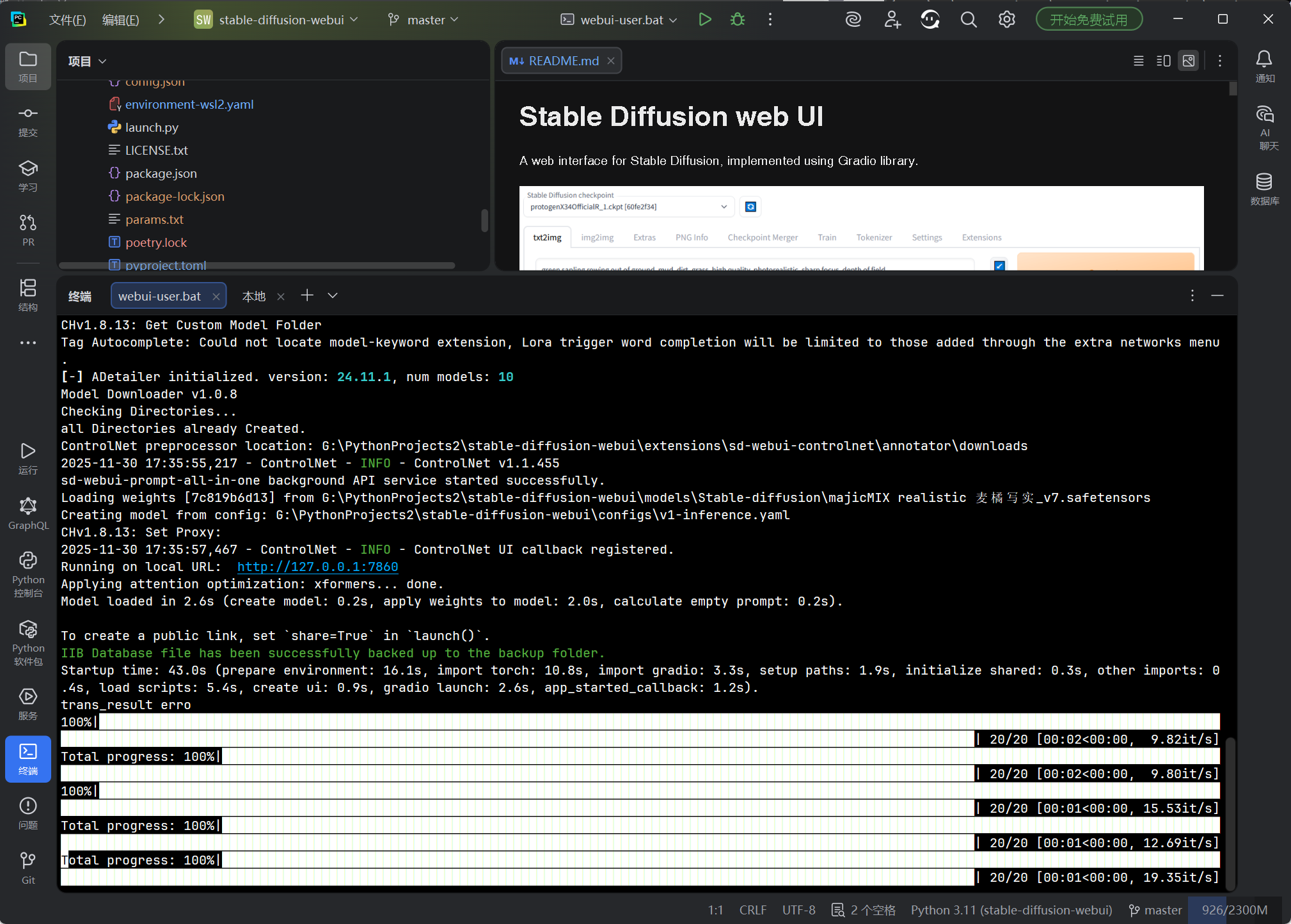 G:\PythonProjects2\stable-diffusion-webui - 现象:PyCharm Terminal 显示