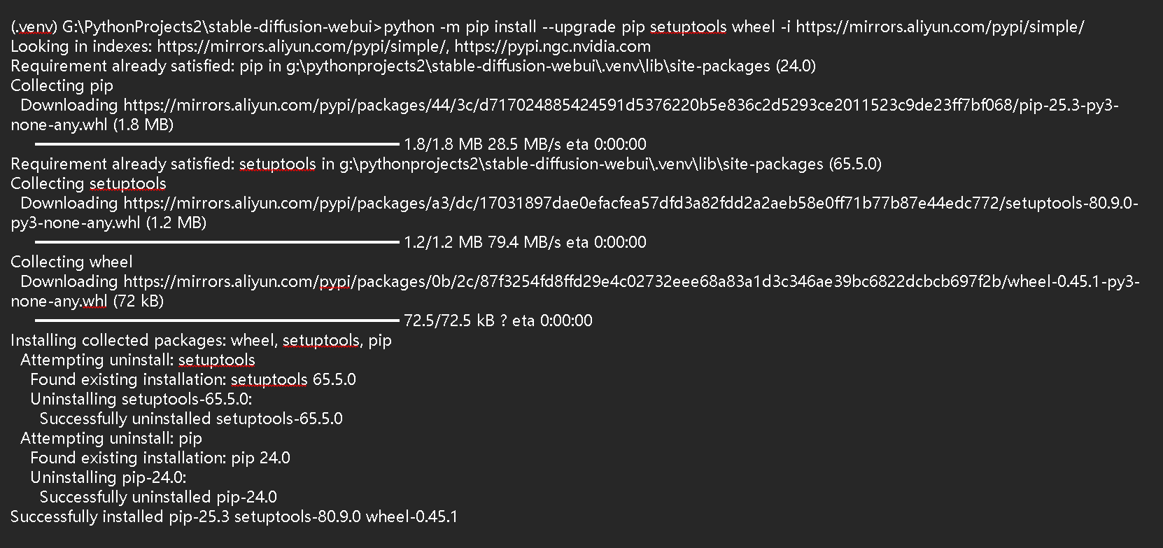 | 6. 升级三件套 | python -m pip install --upgrade pip setuptools wheel -i https://mirrors.aliyun.com/pypi/simple/ 从 pip 24.0 → 25.3,setuptools 65.5 → 80.9,wheel 0 → 0.45.1 |