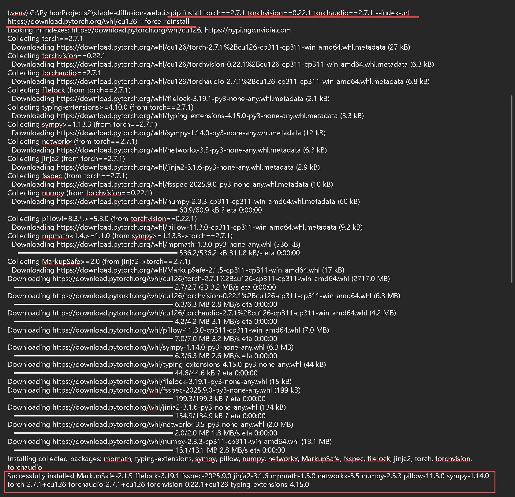 | 7. 安装 PyTorch CUDA 12.6 | pip install torch==2.7.1 torchvision==0.22.1 torchaudio==2.7.1 --index-url https://download.pytorch.org/whl/cu126 --force-reinstall 2.7 GB 轮子 3.2 MB/s 约 15 min 完成 |