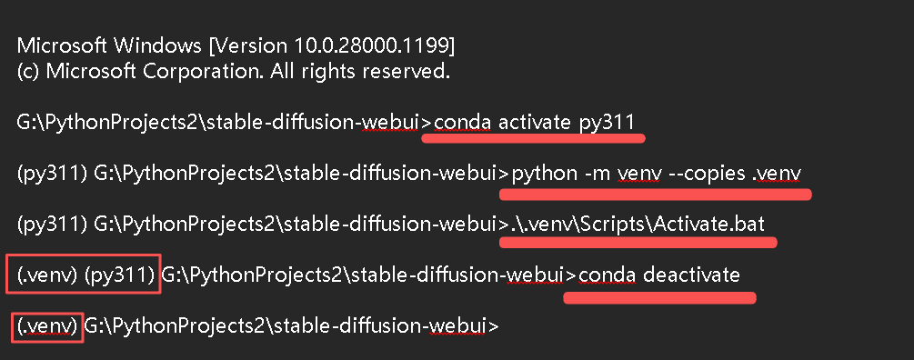 | 2. 用 conda 基础 Python 新建 venv | conda activate py311 python -m venv --copies .venv |