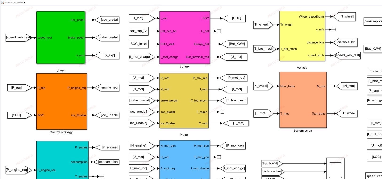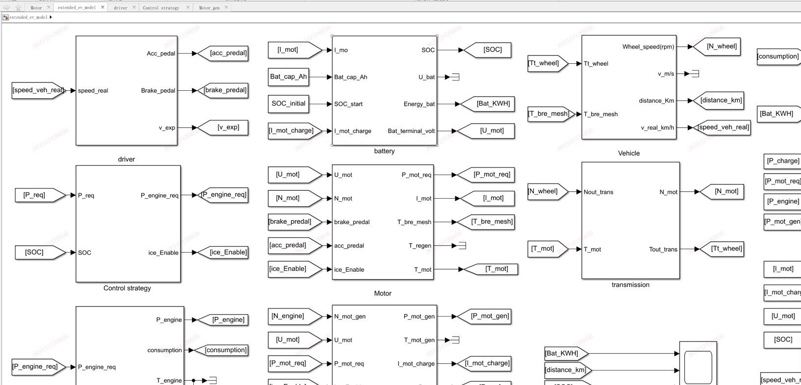 先看模型架构(随手打开Simulink界面截图):最左边是驾驶员油门开度输入,中间串着VCU控制模块,右边并联着电机驱动系统和增程器系统。这种架构很像现实车辆的总线布局,油门信号像神经冲动一样传导到各个执行器。