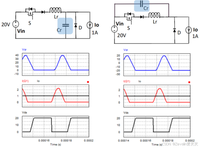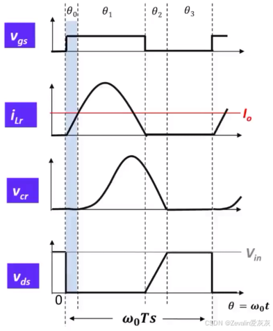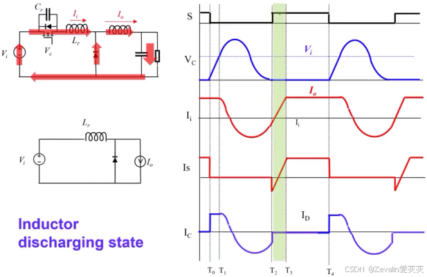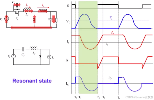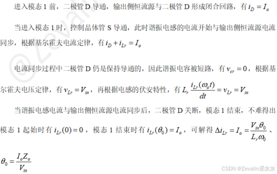 (1)如下为Buck ZCS半波准谐振变换器的等效电路及电路参量波形,其中,负载和输出一阶低通滤波器视为恒定电流源,所有半导体器件和无源器件都是理想的。