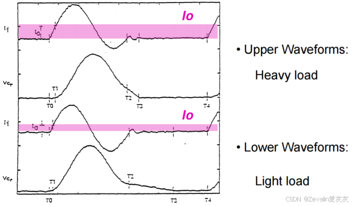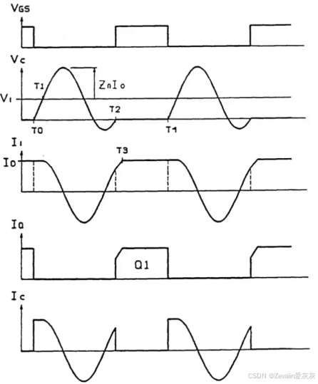 (2)如下为ZVS准谐振变换器中开关器件的电流电压波形,这与谐振变换器中的不一致,但本质上也是在零电压时对开关状态进行切换,切换过程中电流乘以电压对时间的积分结果为零,也即不产生损耗,此外,这里的电流与电压波形是不发生重叠的。