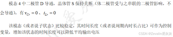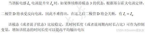 由于谐振开关中没有二极管,当谐振电感电流过零且晶体管关断后,电流可从晶体管的体二极管流过(此时谐振腔中的能量会回馈至输入端,尤其是轻载时,回馈电流的有效值更高),直到电流再次过零,体二极管无法导通与之阳阴极反向电流,整个开关管S才会真正关断,进入模态3