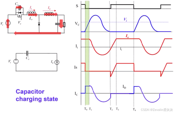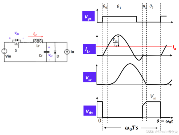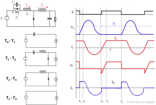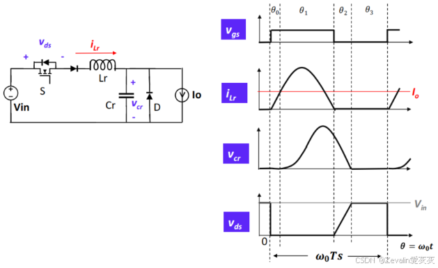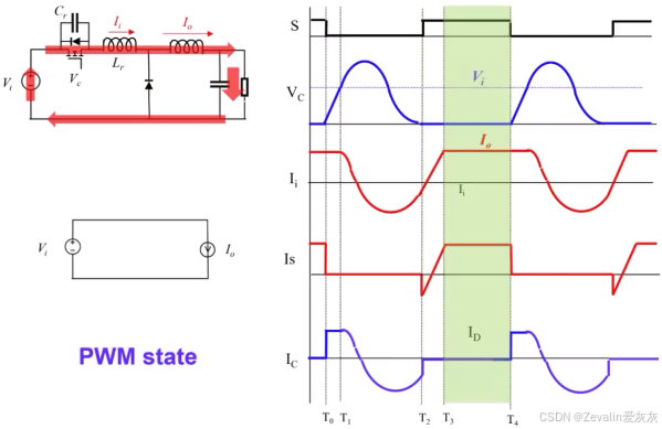 (1)如下为Buck ZCS全波准谐振变换器的等效电路及电路参量波形,其中,负载和输出一阶低通滤波器视为恒定电流源,所有半导体器件和无源器件都是理想的。