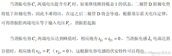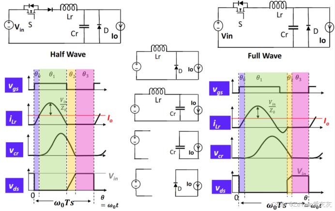 前面提到了半波谐振开关网络有两种,它们的差异点为谐振电容的位置不同,但实际上它们二者的作用是等效的,仅仅是谐振电容的电压取值区间不同,模态分析基本是高度相似甚至完全一致的