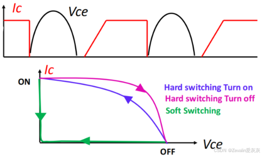 (1)如下为ZCS准谐振变换器中开关器件的电流电压波形,这与谐振变换器中的不一致,但本质上也是在零电流时对开关状态进行切换,切换过程中电流乘以电压对时间的积分结果为零,也即不产生损耗,此外,这里的电流与电压波形是不发生重叠的。