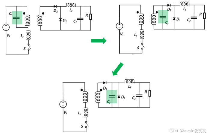 (2)对于带有变压器的准谐振变换器,其谐振腔的元件可以分布在变压器两侧,经过等效分析后,其实它们就是等效于位于同一侧的谐振腔。下图所示的是正激ZCS准谐振变换器的网络拓扑演变(二极管D2摆放的位置决定谐振电感是否可以通过双向电流,也就是决定了是全波还是半波变换器)。