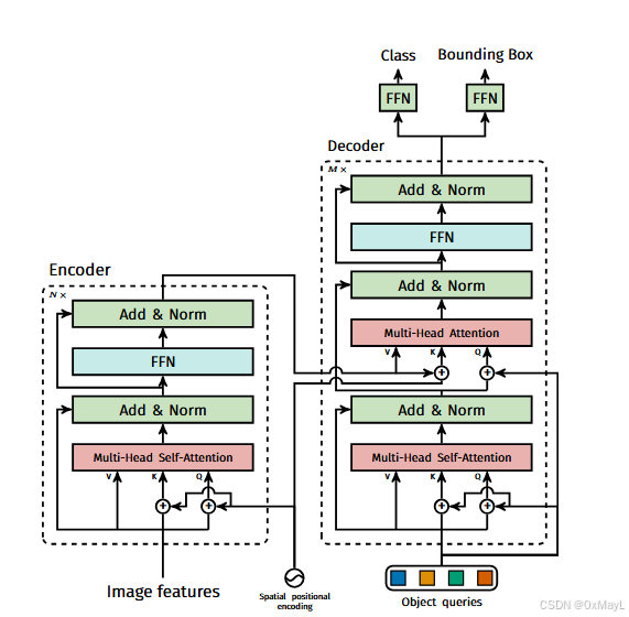 最终输出的维度也是RN×DR^{N\times D}RN×D,这N个锚框经过FFN分别得到分类结果和锚框坐标。