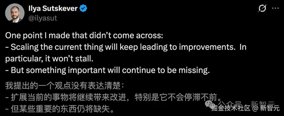 恰在昨天,Ilya 最新发文称,Scaling 不会停,但某个重要的东西仍然会缺失。