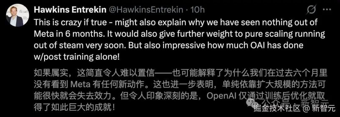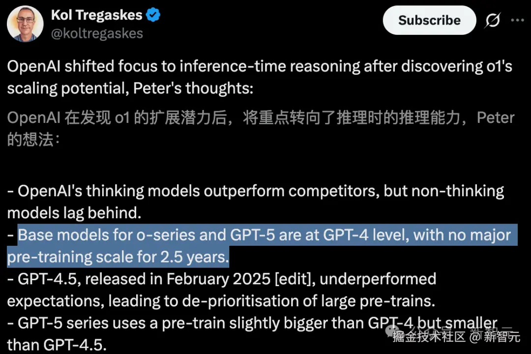 OpenAI 顶尖团队自 GPT-4o 发布之后,迄今尚未完成一次完整的,为下一代前沿模型设计的大规模预训练。