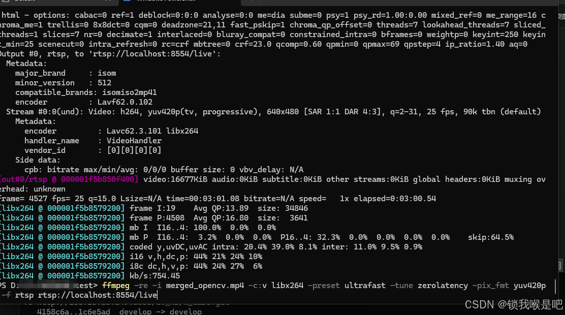 ffmpeg -re -i merged_opencv.mp4 -c:v libx264 -preset ultrafast -tune zerolatency -pix_fmt yuv420p -f rtsp rtsp://localhost:8554/live