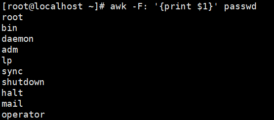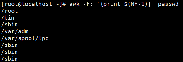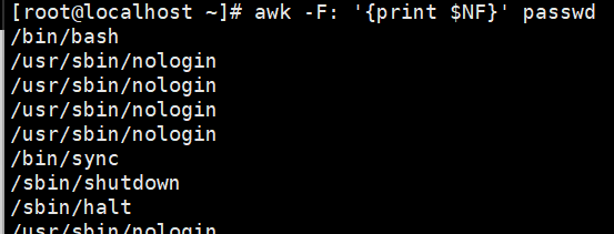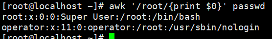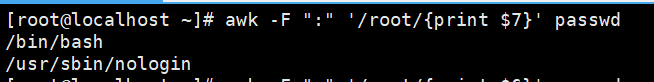 搜索passwd文件有root关键字的所有行,以:拆分并打印输出第7列