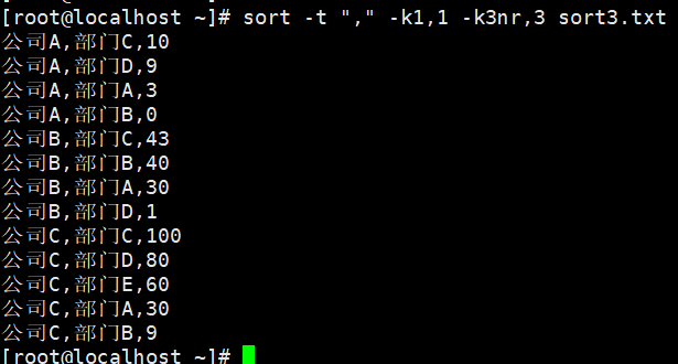 要求:以","分割先对第1列字符串升序,再对第3列数字降序