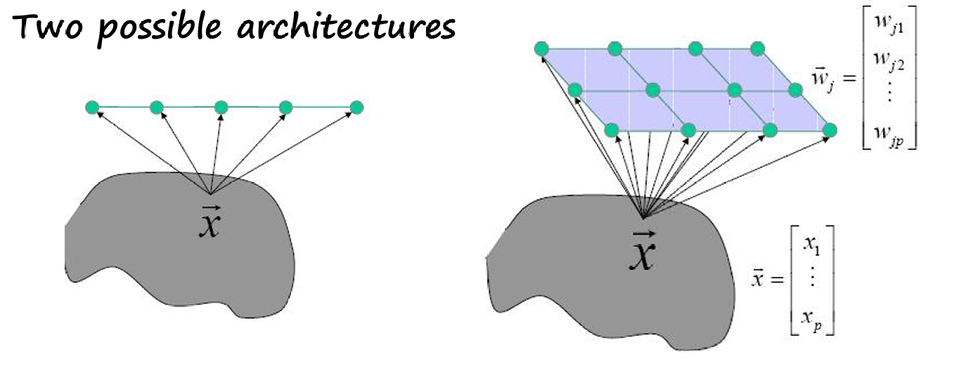 二维架构:在这种架构中,输出层是二维的,通常表示为一个网格或矩阵的神经元。每个神经元也与输入层的所有神经元相连。