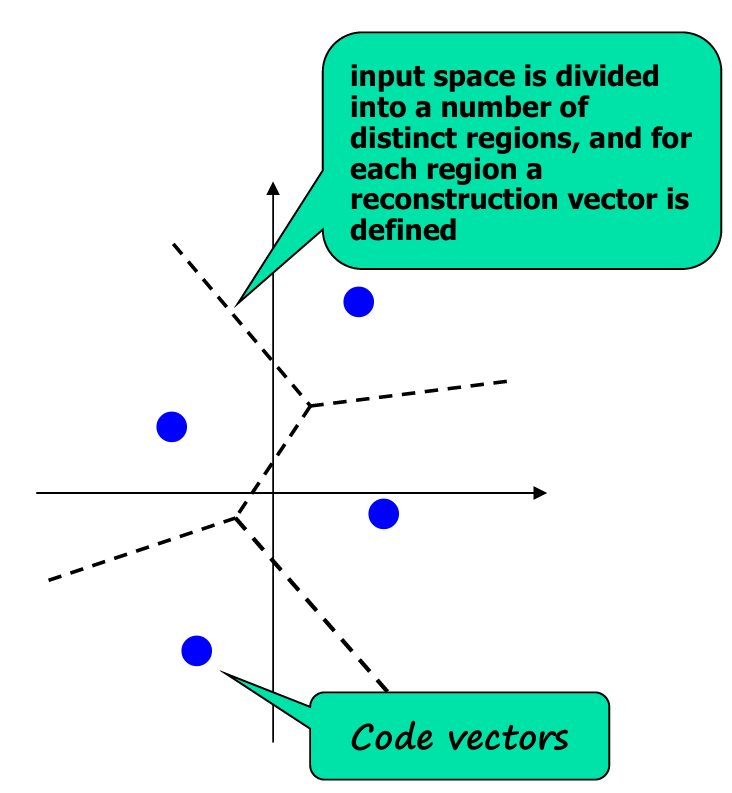 可能的参考向量的集合被称为量化器的码本(codebook),其成员被称为码向量(code vectors)。