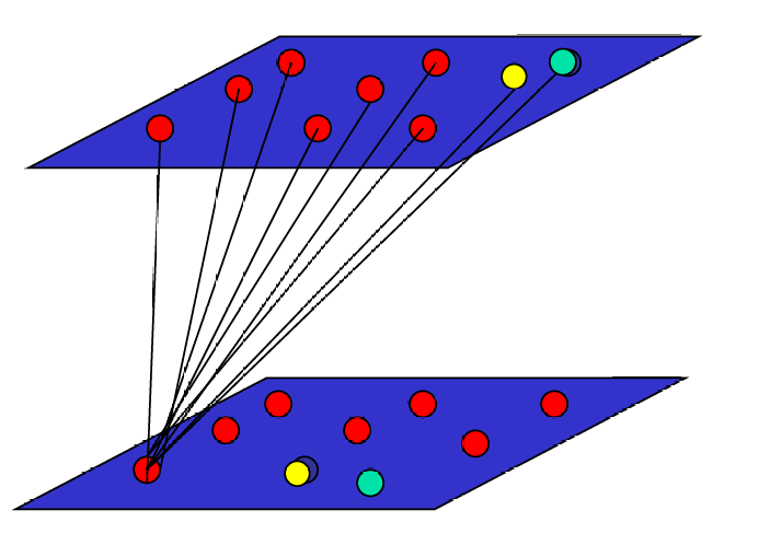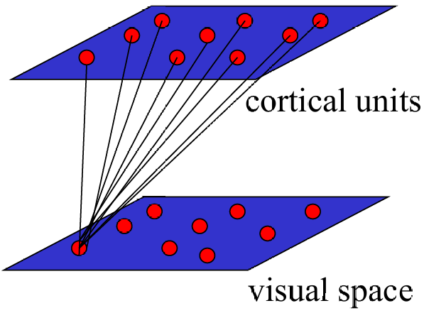 我们现在将每一层皮层单元(cortical units)通过希伯(Hebbian)单元完全连接到视觉空间(visual space),这便是两层网络。(希伯学习是一种基于时间接近性的学习规则,即"一起激活的神经元连接在一起"。这意味着如果两个神经元经常同时激活,它们之间的连接会加强)