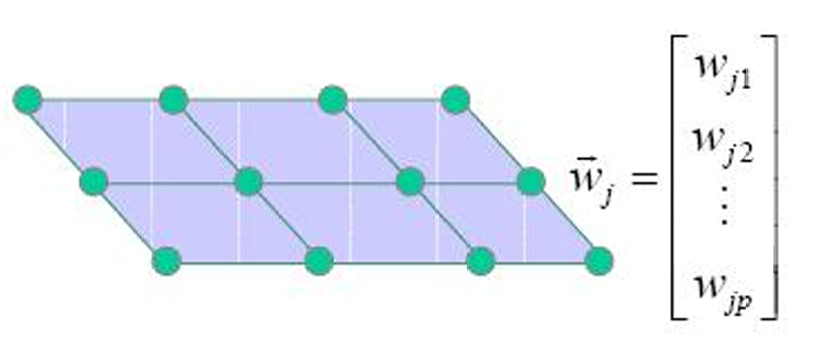 网格中的每个节点代表一个神经元,每个神经元都有一个权重向量 w ⃗ j \vec{w}_j w j,其维度与输入向量相同。