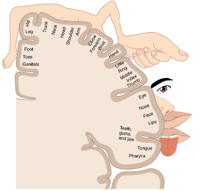 下图给出了一个具体的例子:大脑皮层的体感映射(cortical homunculus),它展示了身体各部分在大脑皮层上的对应位置。