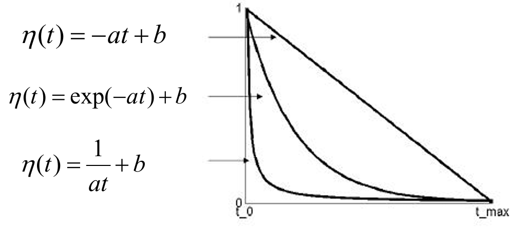 这种学习率随时间的倒数递减,从 b b b开始,递减速率由参数 a a a控制。