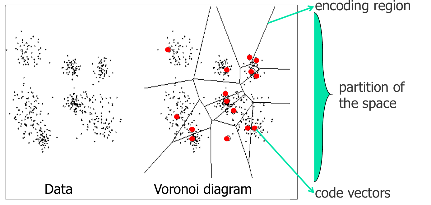 右侧(Voronoi diagram):显示了这些数据点如何被划分为不同的Voronoi单元。每个单元由一个中心点(红色点)定义,这些中心点是码向量(code vectors)。每个单元包含所有比任何其他中心点更接近该中心点的数据点。