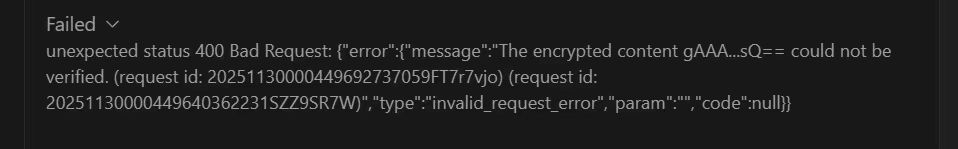 "message": "The encrypted content gAAA...lA== could not be verified.",