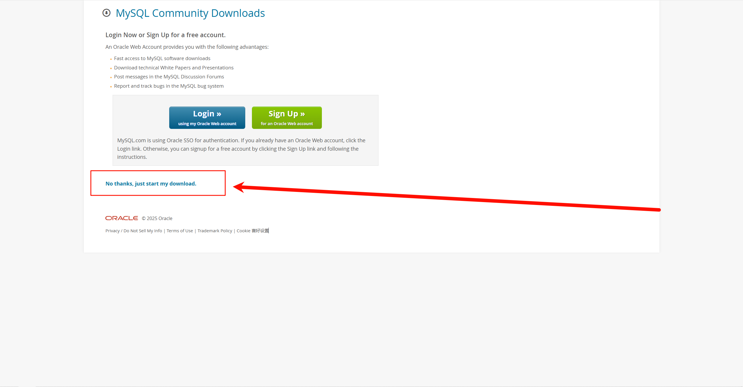 如果提示你登录账号,点击No thanks, just start my download即可跳过。