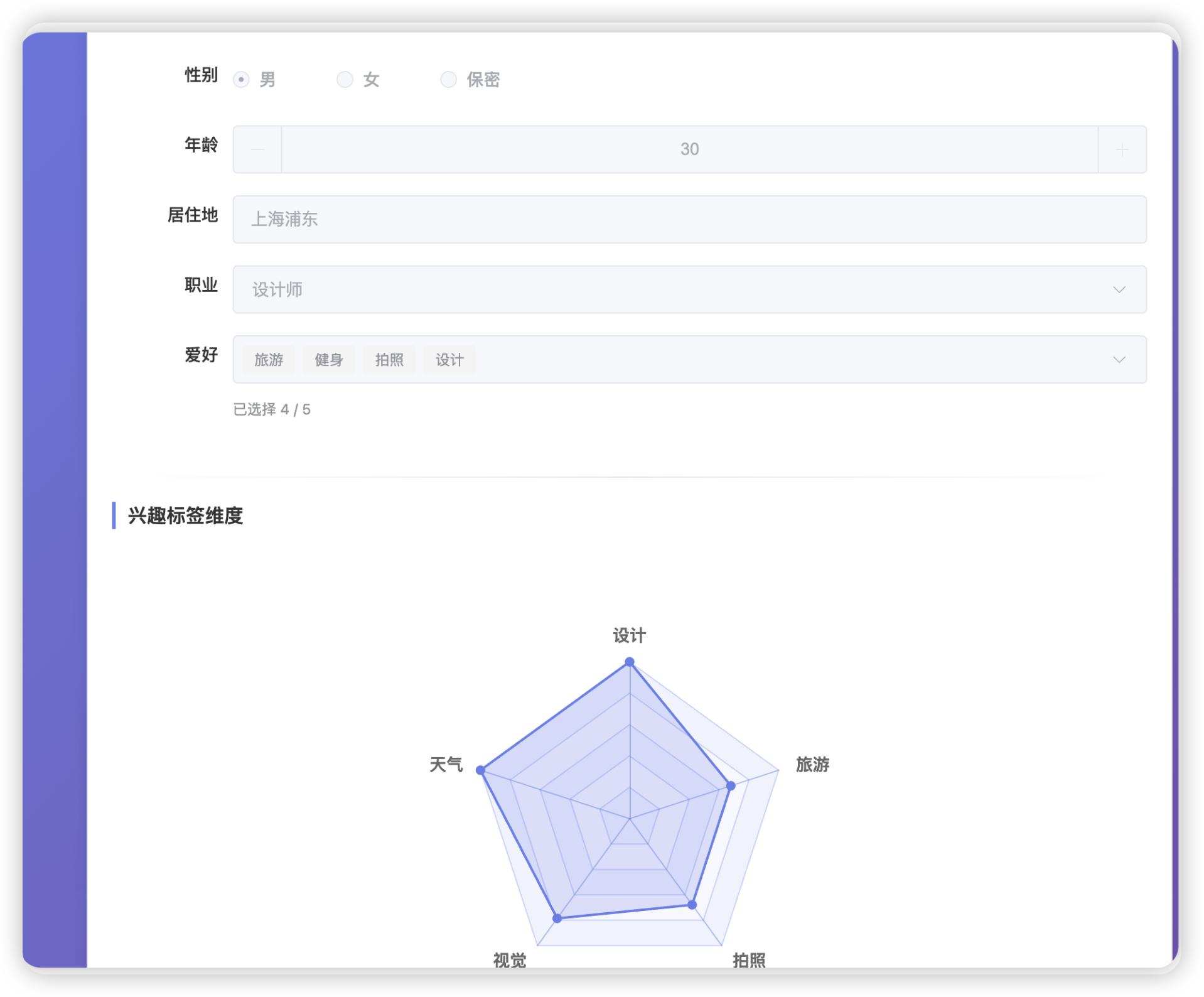 这是另外一个账户的个人信息,他是我用来测试的爱好旅游的,所以标签不太一样