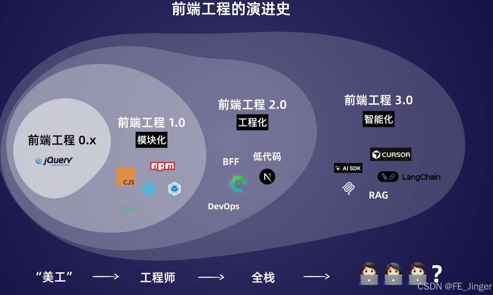 前端的发展史,本质上是"职责边界持续扩展、技术能力不断深化"的历史。从最初的"美工+简单交互",到如今的"全栈研发+AI协同",大致经历了三个关键阶段: