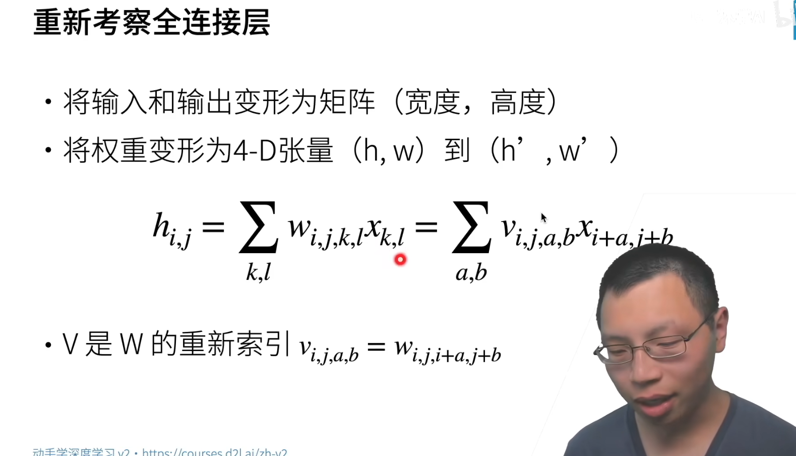 4D张量,就是一个权重,可以这么理解,一个图片是二维的矩阵,那么输出的特征或者图片也是二维矩阵,但是原先的输入的一个元素需要乘以一个权重转换到另一个矩阵对应的位置,那么这个权重如何表示是一个特征图的点对应另一个特征图上的点。那么这个四维的张量就表示出来的。前面两个维度表示第一个特征图的索引,用h,w的分量k,l表示,后面的用i,j表示。
