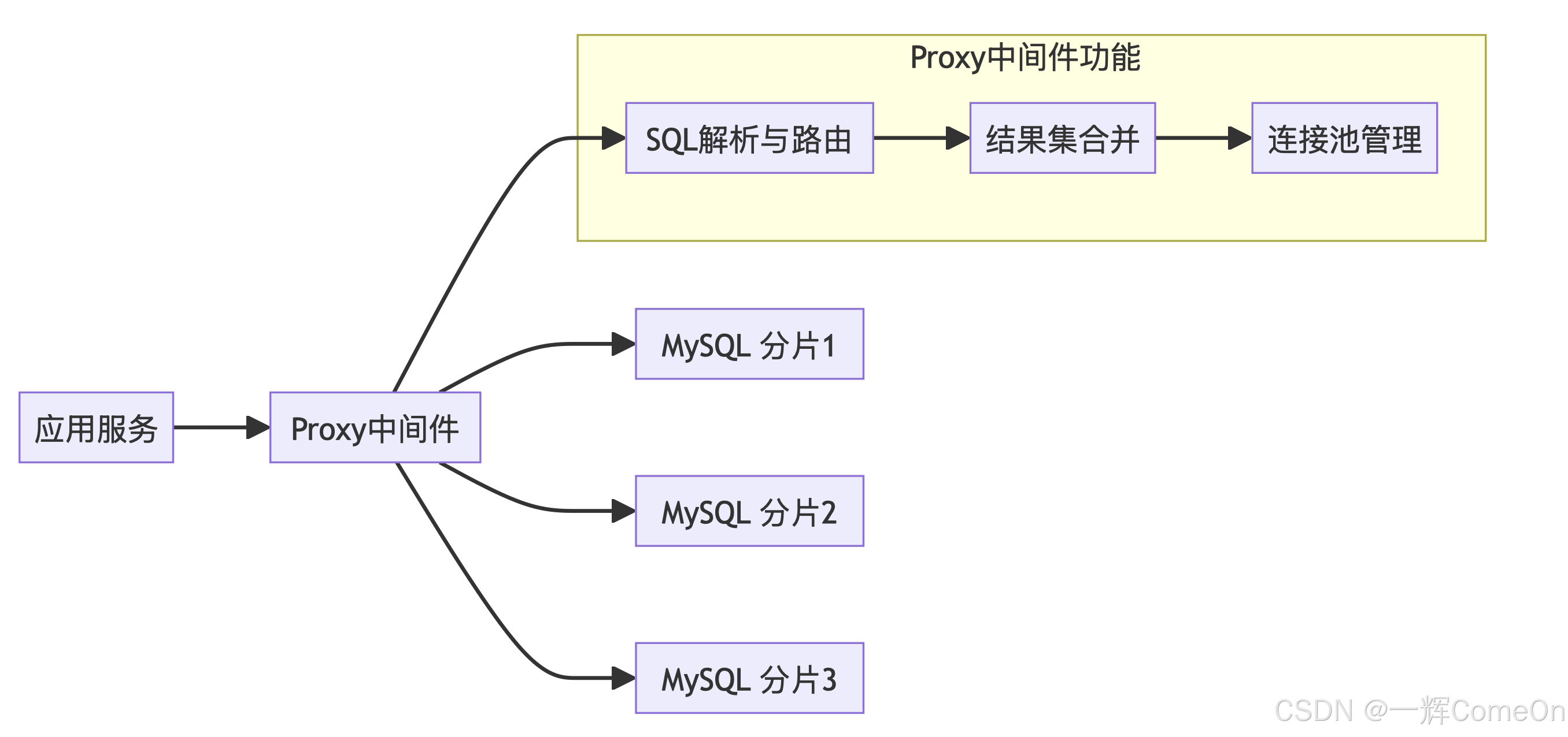 Proxy模式中,应用服务像连接普通MySQL一样连接Proxy,所有分片逻辑都在Proxy内部处理,对应用完全透明。