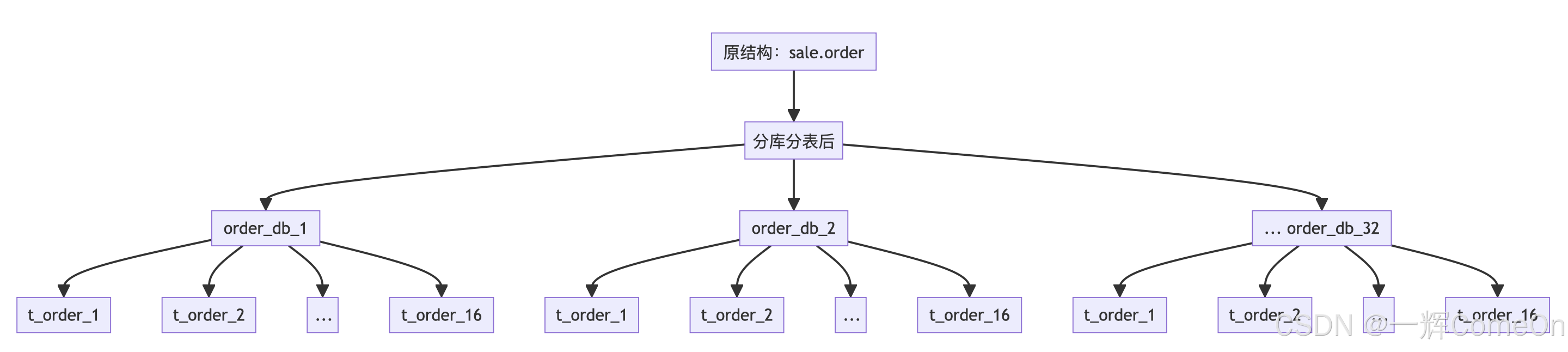 原本订单表是sale库下的order表,分库分表后变为 多个order库的下的多个order表. 当然 订单子表也是多张。 sale.order -> order. [ t_order_1 , t_order_2 ... ]