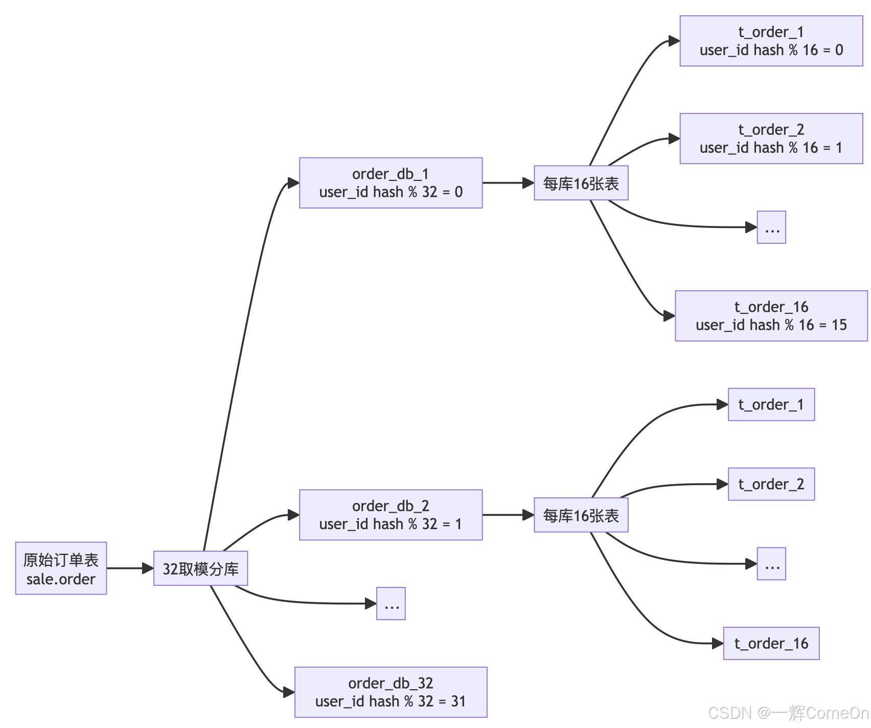 1)分片策略是否可以让新表数据的迁移源只有一个旧表,而不是多个旧表?这就是前面建议使用2n次幂分表的原因------以后每次扩容都能扩为2倍,都是把原来一张表的数据拆分到两张表中。原来一张表的数据,下次扩容时只需平分成两份,各自迁入两个新表。数据来源单一,迁移路径明确,不会出现"父子关系混乱"(从多个旧表迁入一个新表)。