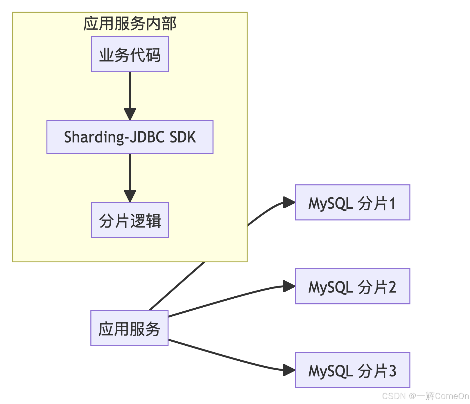 | 优点 | 1. 对应用透明 :应用像连接单一数据库,无需感知分库分表逻辑。 2. 支持多语言 3. 升级方便:中间件独立升级,不影响业务应用。 | 1. 性能更高 :无网络中转,直连数据库,链路更短,延迟更低。 2. 运维简单 :无需部署和维护独立的代理服务。 3. 代码灵活可控:分片逻辑在应用内,更易于定制和精细控制。 |