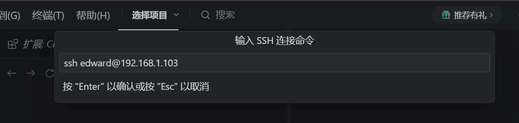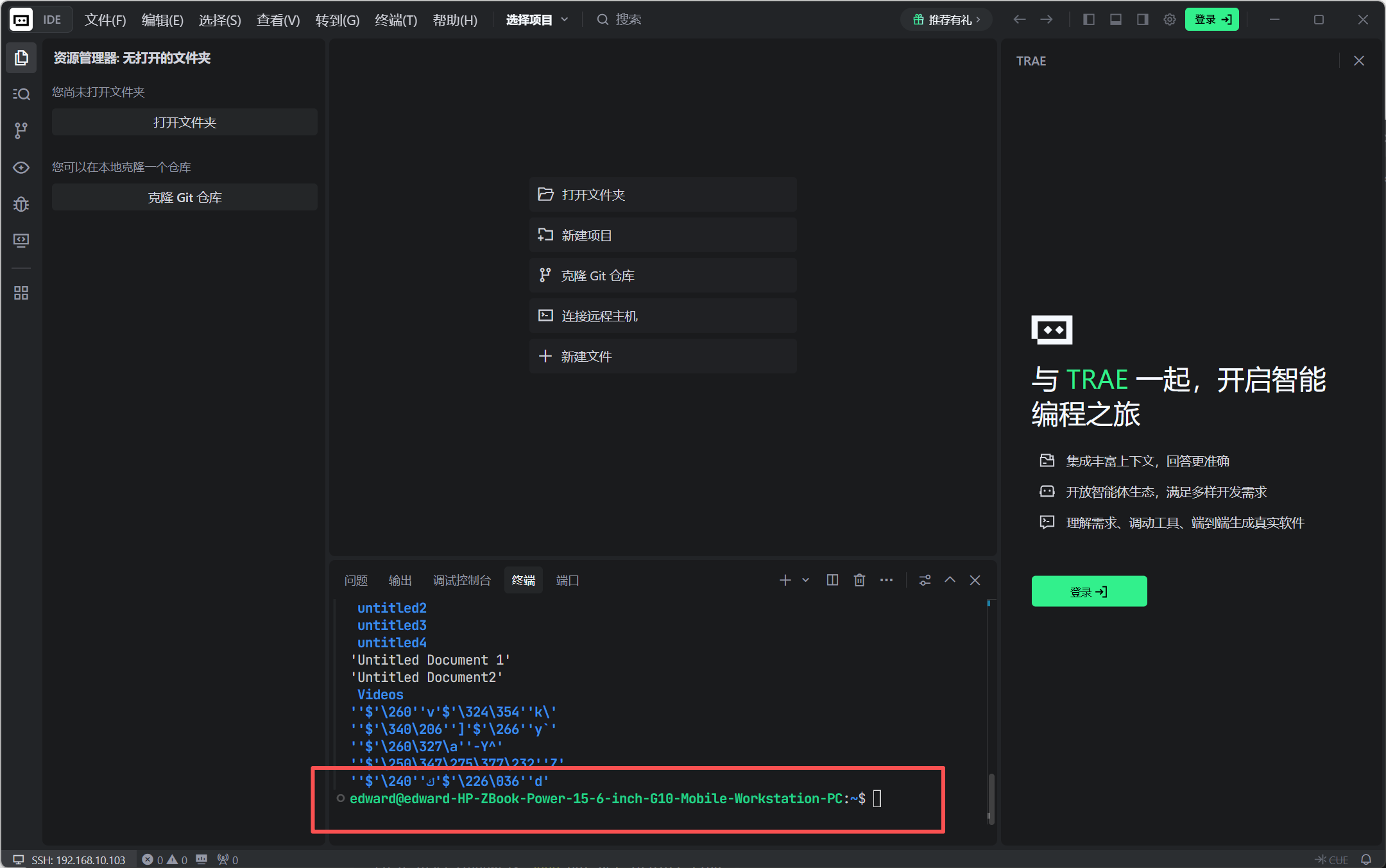 我这里查询到我的ubuntu电脑用户名是"edward",ip地址为"192.168.10.103"。