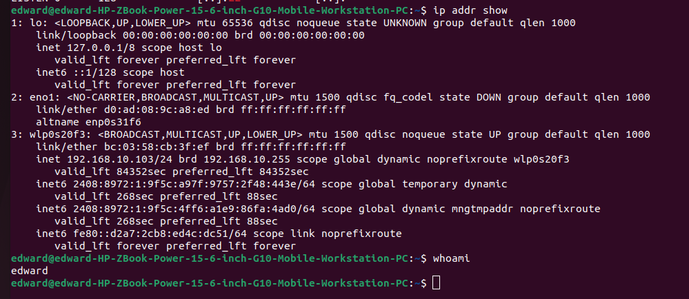 连接一般不推荐root用户直接连接,有些电脑也不允许SSH root方式连接,用普通用户连接就行,使用whoami命令查看当前用户名称,ip addr show 或者ifconfig 命令查看当前ubuntu电脑ip地址(注意,这里SSH连接需要两台电脑处于同一个局域网里面,可以用ping命令ping一下双方是否通信正常):