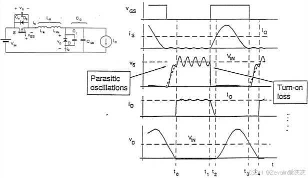 不难发现实际电路中有不少寄生参数,开关管S的寄生电容可以和与之并联的谐振电容合并,开关管S的寄生电感可以和谐振电感串联,这两个都可以在设计阶段设法"消消乐",但二极管D的寄生电容无法与其它元件合并,它会在开关管S开通时产生不必要的谐振现象,从而引起两端电压振荡,进而严重影响电压增益
