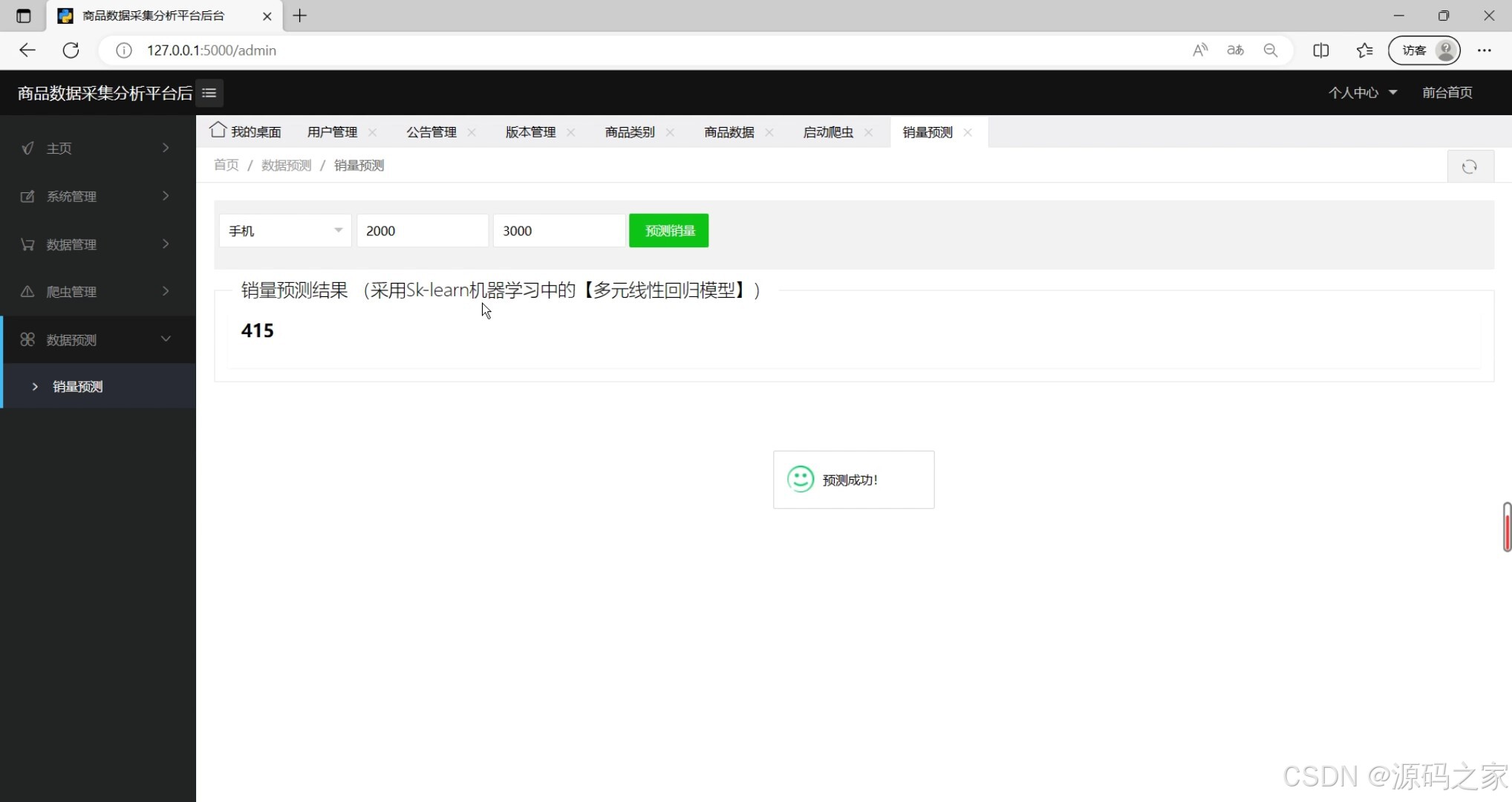 - 核心功能:淘宝商品数据自动化采集(支持定时爬虫任务)、数据清洗与结构化存储、多维度Echarts可视化大屏展示(销量/价格/品类趋势)、商品销量预测(多元线性回归驱动)、后台数据管理(商品/用户数据维护)、用户认证(注册登录/权限管控)
