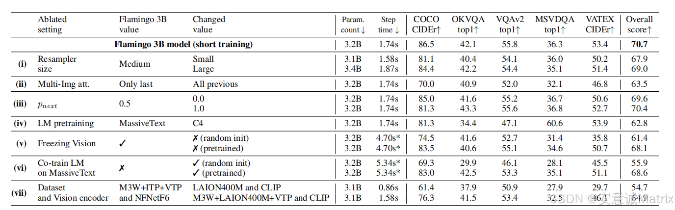 - 消融实验结论:M3W数据关键(移除性能降17%)、冻结LM避免灾难性遗忘、Perceiver Resampler优于MLP/Transformer