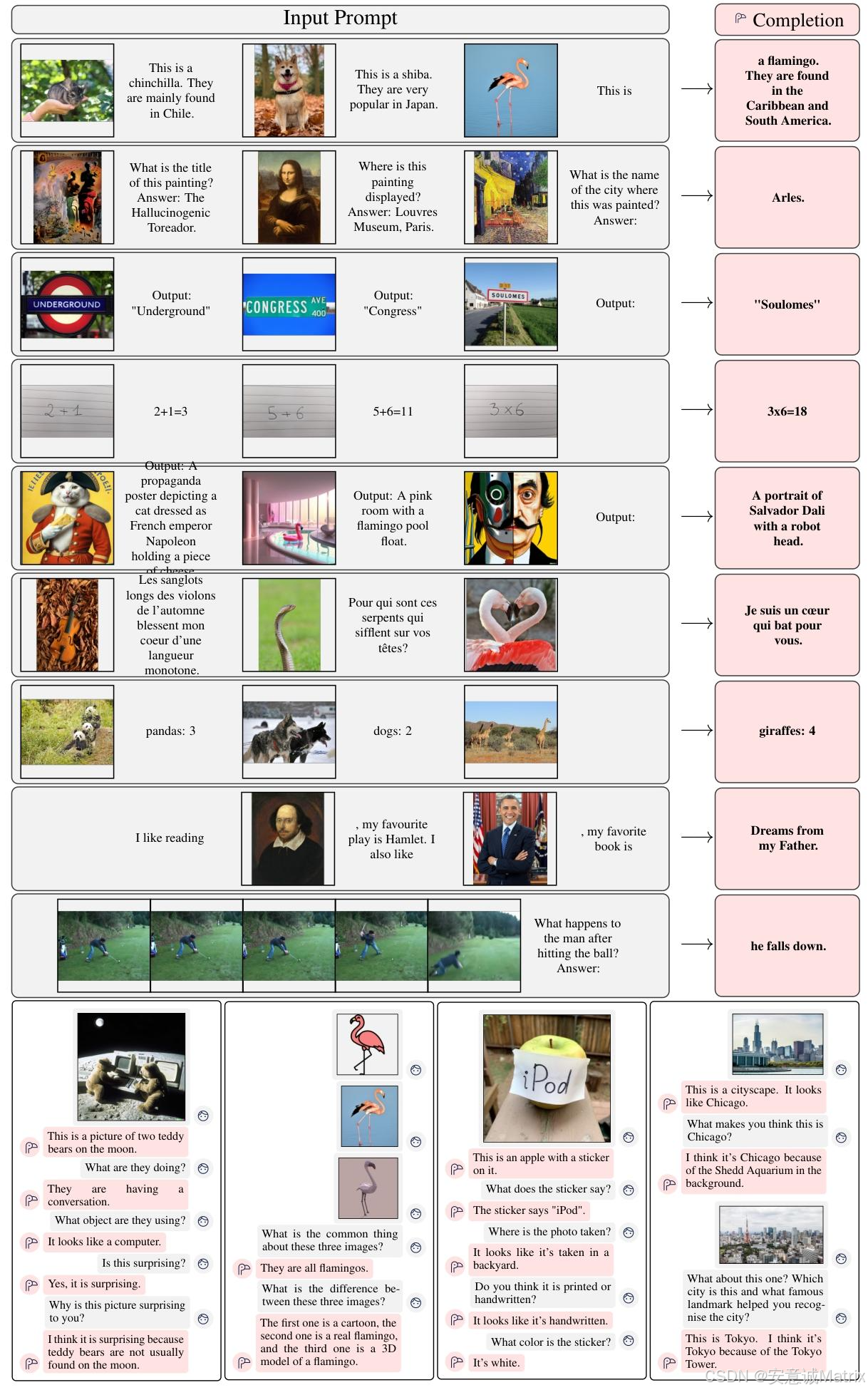 - 方式:构建interleaved多模态提示(支持示例对:(图像/视频, 文本)),示例后接查询视觉输入;