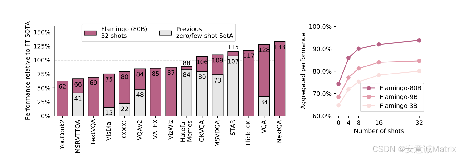 - 模型规模与shots数量正相关:Flamingo-80B(80B)性能最优,32-shot优于4-shot/0-shot;