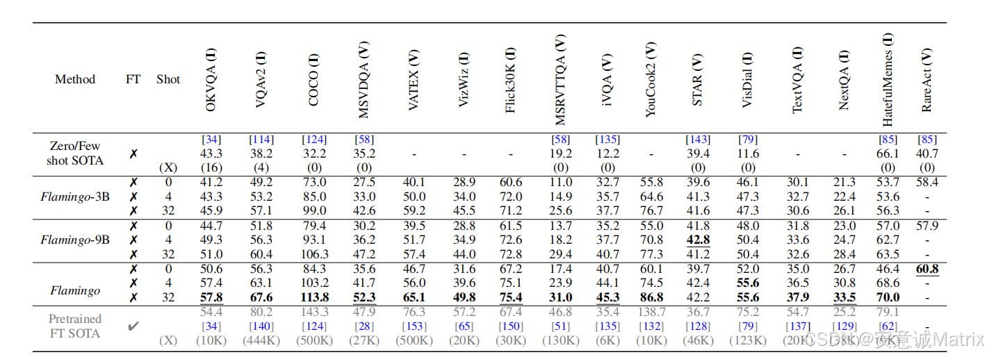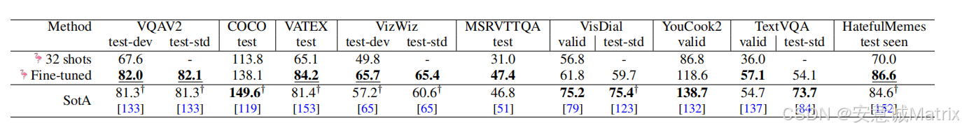 | 任务 | 此前微调SOTA(数据量) | Flamingo-80B(32-shot) | 提升幅度 |