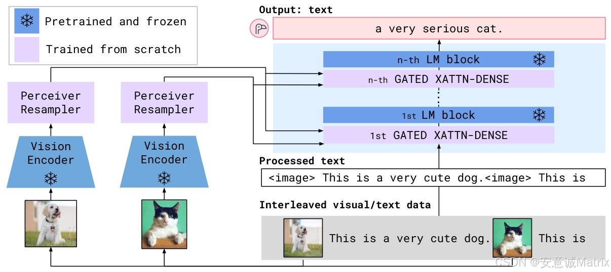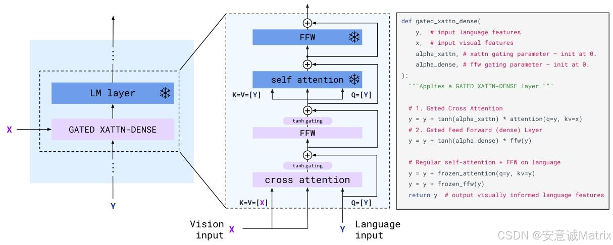 | GATED XATTN-DENSE层 | 插入LM层间,实现视觉对语言的条件约束 | 0初始化tanh门控(α=0,初始输出与原LM一致),交叉注意力(视觉为KV,语言为Q)+ 前馈层 |