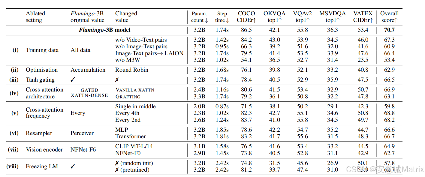 | Flamingo-80B | 70B | 435M | 10B(每7层LM插入) | 194M | 80B |